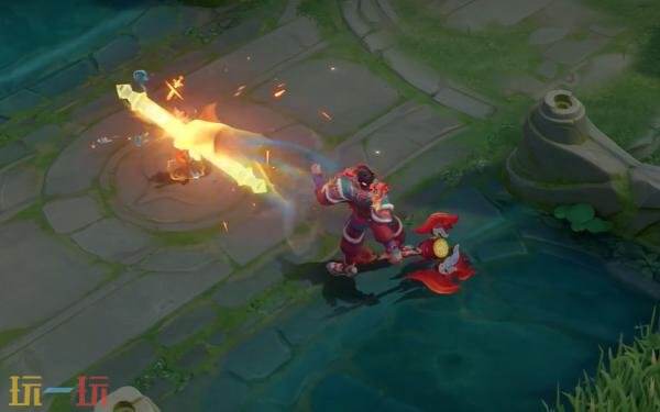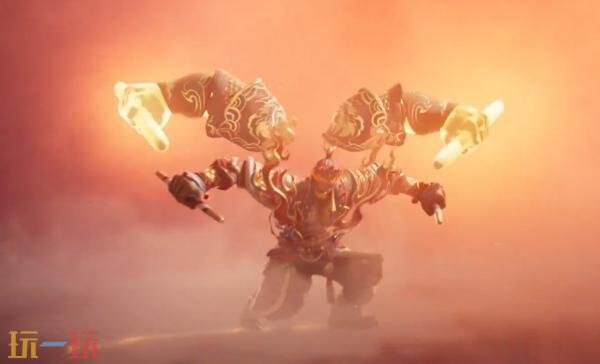 被动技能:能量满蓄,盘古身后凌空幻化出一双手持英歌槌的巨臂。每次敲击皆伴随纹样与火焰飞旋而出。