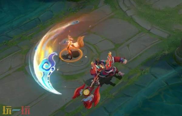普通攻击:刀光以传统纹样构成,挥砍时拖曳火焰轨迹并伴有火星迸溅。