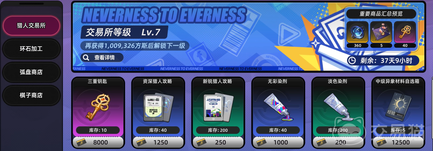 第二类为猎人交易所:使用基础货币方斯进行兑换,单期兑换上限充足,支持持续积累。方斯通过日常任务、体力消耗等常规行为稳定产出,是零氪及微氪玩家最可持续的获取渠道,推荐作为主力资源来源。