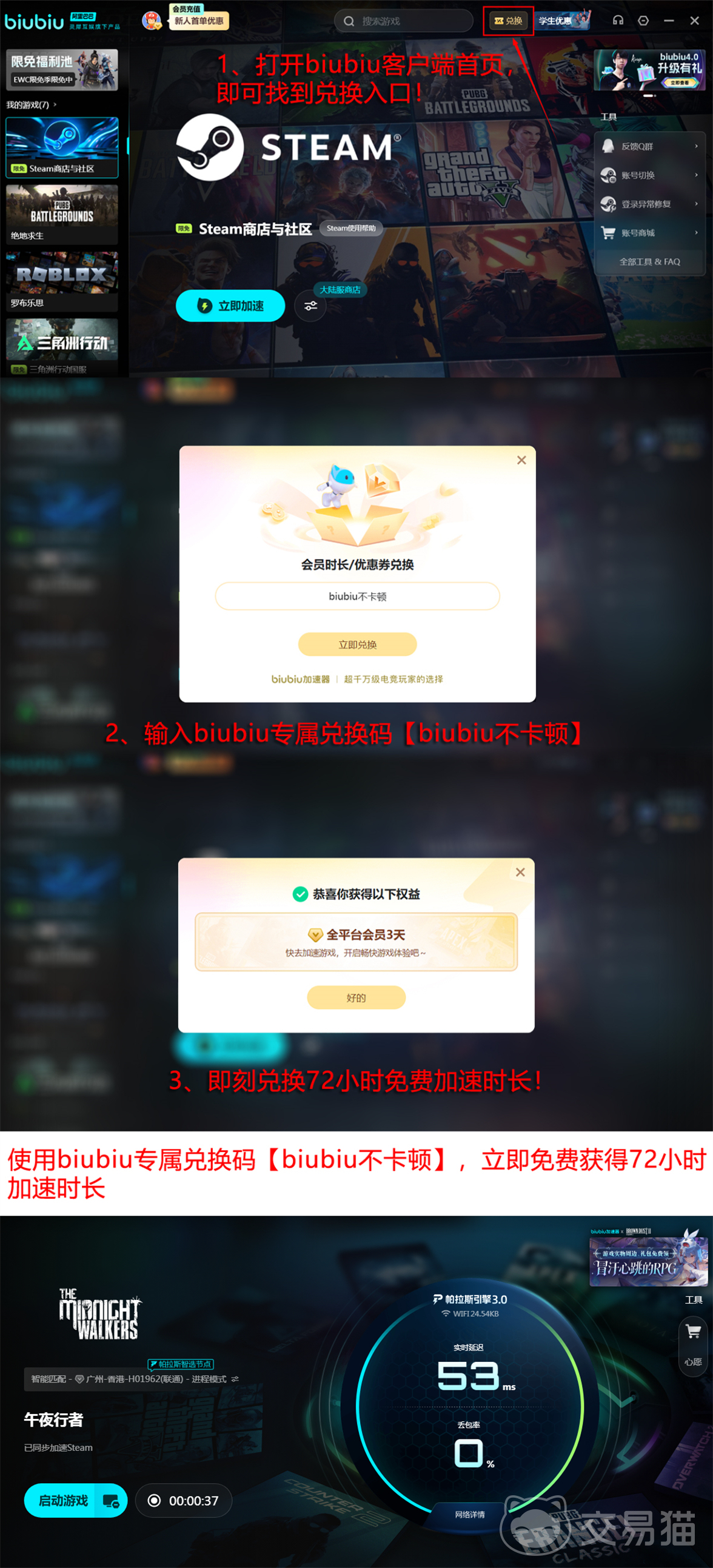 新用户注册即可获得24小时全节点免费加速权限,并可凭通用兑换码【biubiu不卡顿】额外领取72小时专属加速时长,总计享有96小时无门槛体验周期,充分覆盖新手熟悉阵容、磨合走位、攻克首支精英Boss的完整成长路径。