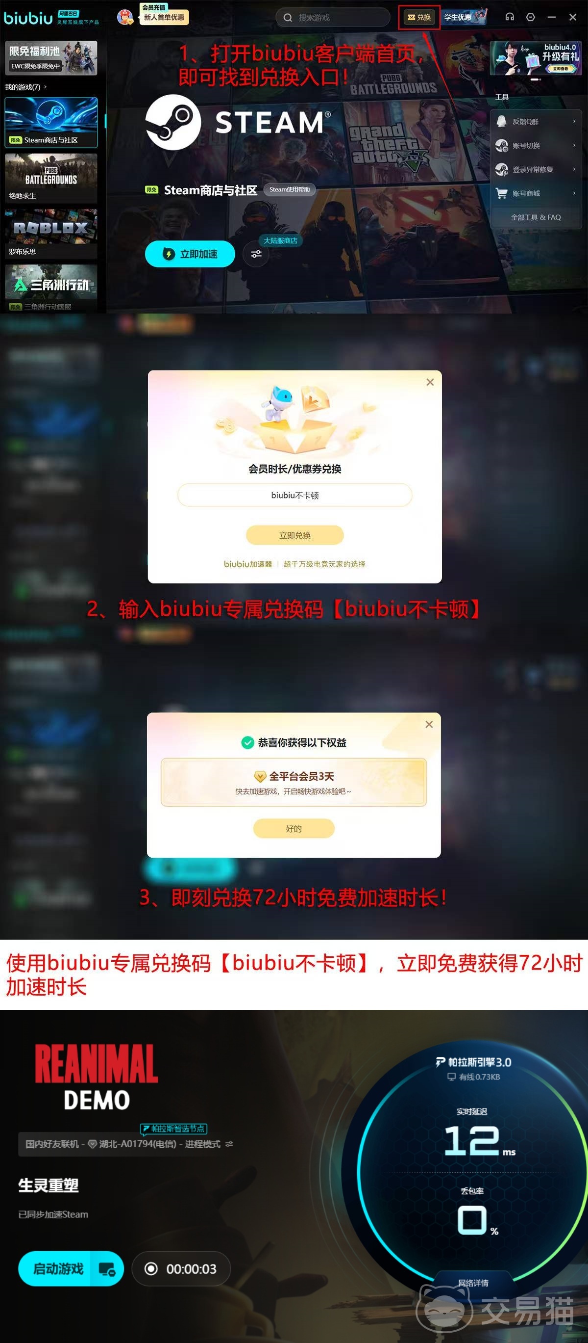 新注册用户首次登录biubiu加速器可自动获得24小时全功能免费加速权益;输入专属兑换码【biubiu不卡顿】,还可额外领取72小时连续加速服务,无需绑定支付方式即可生效。