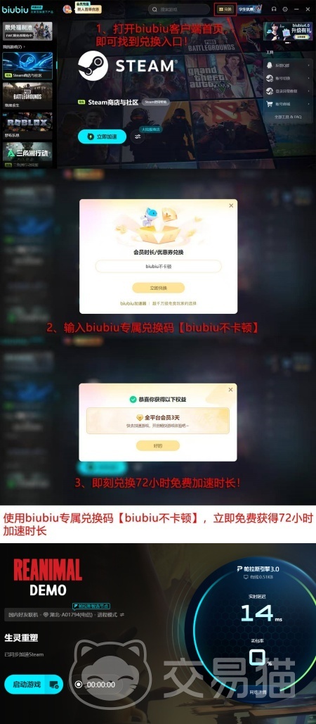 针对首次使用的用户,平台现开放基础福利:注册即赠24小时全节点免费加速权限。若在激活环节输入兑换码【biubiu不卡顿】,还可额外获得72小时高级加速服务时长。