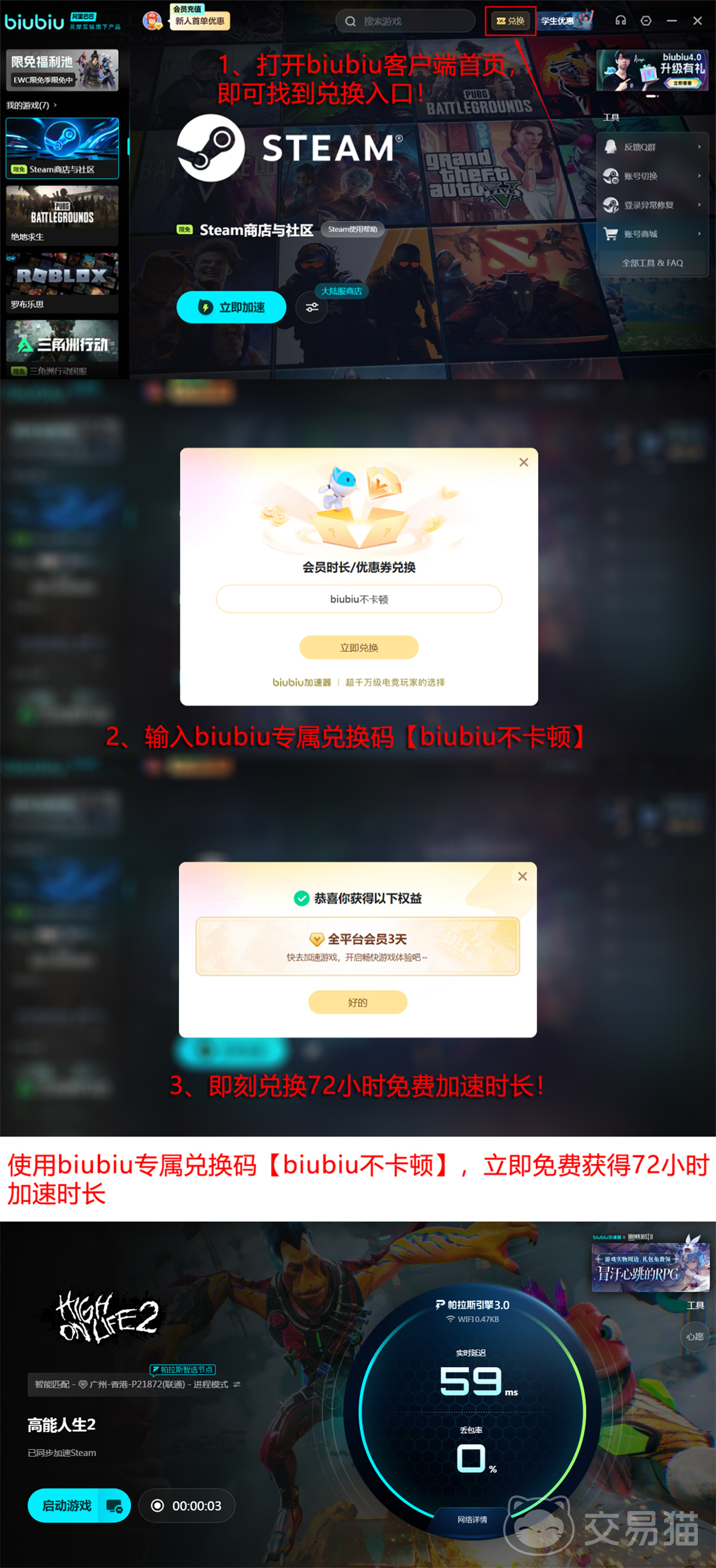 新用户注册biubiu加速器后,可直接获得24小时免费加速时长。此外,每位账号享有一次使用兑换码【biubiu不卡顿】领取72小时加速服务的权益,累计可享96小时零门槛加速体验,大幅降低新手入门门槛。
