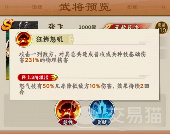 张飞的怒气技能具备双重战术功能:一方面可对敌方前排整列单位发动强力普攻,造成等同于兵种基础伤害231%的物理输出;另一方面,技能拥有5%初始概率使目标全队减伤10%,持续两回合,且该概率随星级提升而递增。