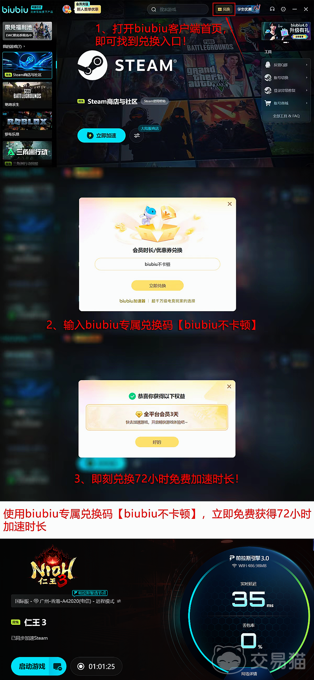 平台同步开放限时加速福利:所有用户输入兑换码【biubiu不卡顿】,即可额外获得3天免费加速时长;新注册用户完成账号激活后,自动领取24小时全场通用加速权益,叠加后总计享96小时免费服务。