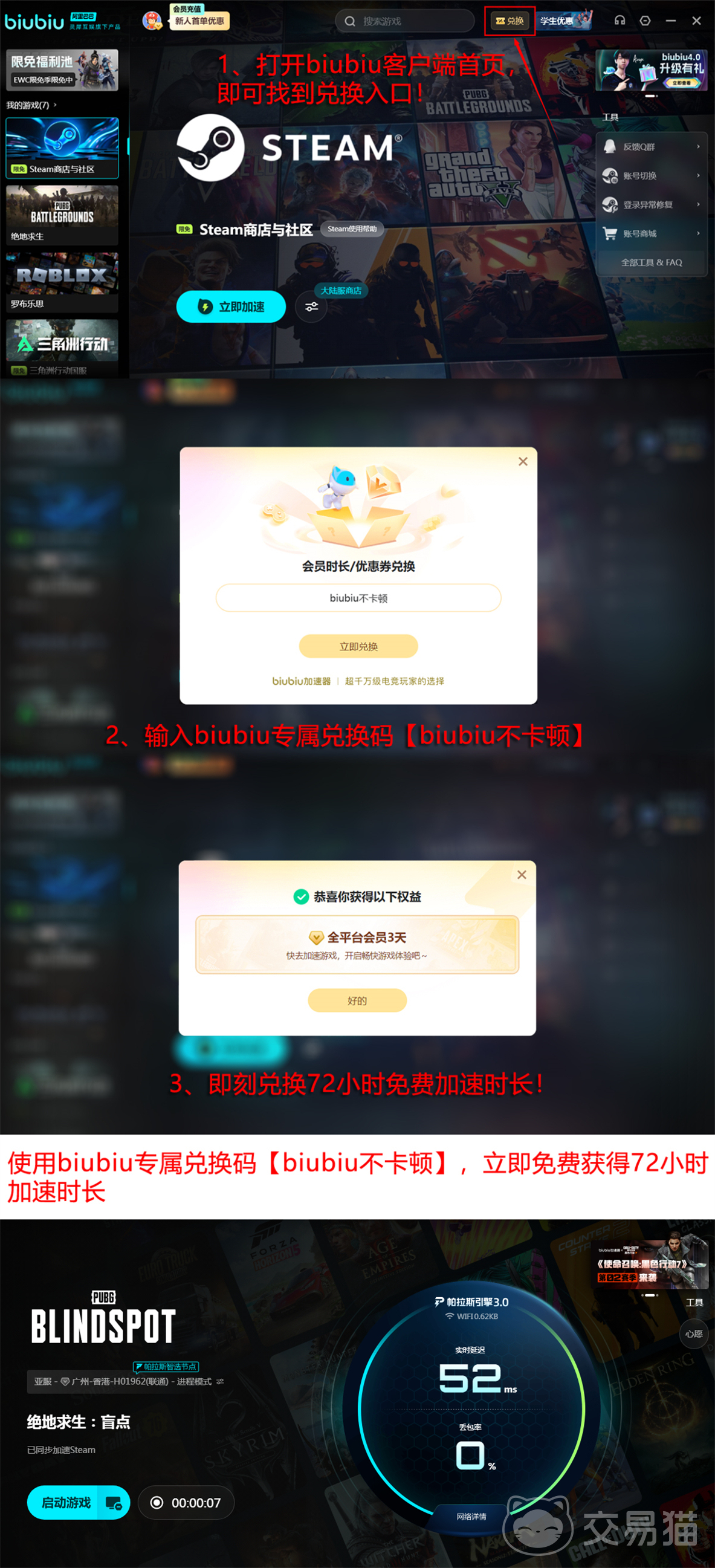 当前提供两种便捷接入方式:新用户注册后可享24小时无限制加速服务;所有账号均可凭通用兑换码【biubiu不卡顿】领取72小时加速权益。两项叠加后,单账户初始可用时长达96小时,足够完成新手引导、基础匹配及进阶玩法熟悉。此外,平台同步整合《绝地求生:盲点》专属攻略库与版本动态资讯,涵盖地图机制解析、载具刷新逻辑、装备搭配策略等内容,助力玩家高效掌握核心玩法。