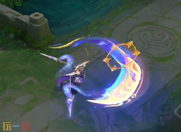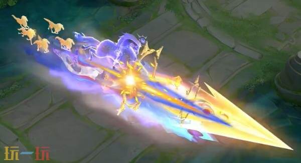 * 一技能:银枪掷出,迅疾如辉。随着神骥穿过东巴纸,银枪化作山岭上的神轮。神骥环绕,光芒贯穿天地。