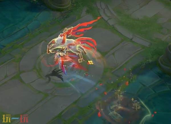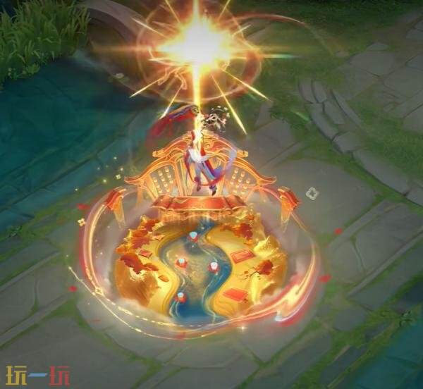 * 三技能:貂蝉翩然起舞,石榴花在红绸的环绕中绽放。五匹队友的神骥踏着丝绸从四面而来,随着朱幔降落,宴饮幻景显现。杯盏悬空,将琼浆玉露倾泻而下,映照出山河万里图。神骥奔腾环绕,欢宴正酣,杯盏莫停。