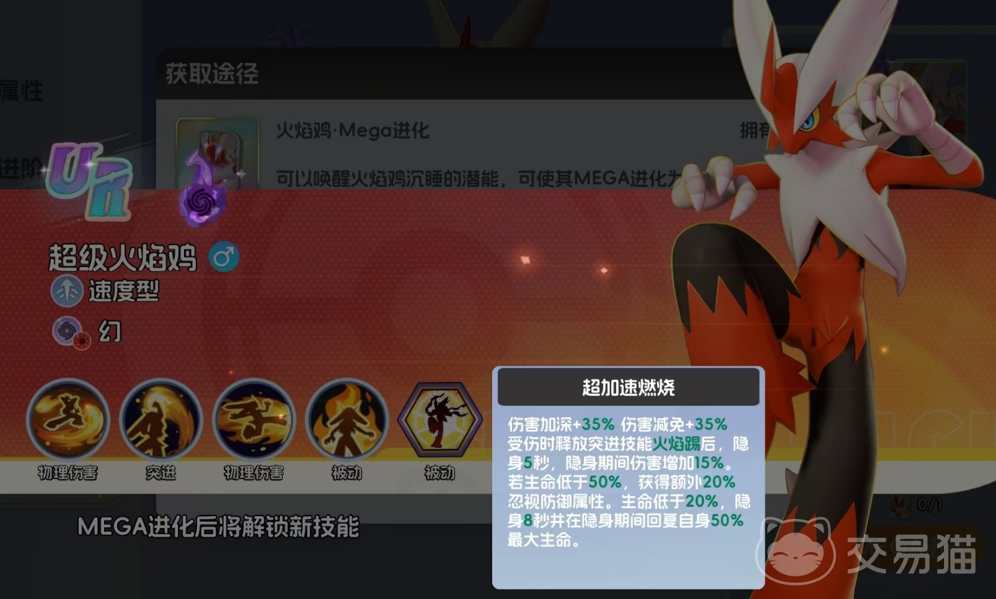 超级火焰鸡完整继承火稚鸡原有四技能体系,并新增专属机制“超加速燃烧”。该机制初始提供5%伤害提升与5%所受伤害降低;当完成全部MEGA进化突破(即升至满阶上限)后,加成幅度提升至35%伤害提升与35%伤害减免。此外,在自身处于受伤状态时释放“火焰踢”,将触发隐身效果,持续5秒;隐身期间,额外获得攻速、暴击率与移速叠加增益,显著强化其切入敌方后排的稳定性与斩杀效率。