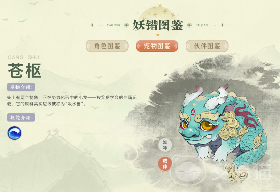 第三位四角兽是苍枢,他头上有两根犄角,进入到成年之后可以化龙,在不少的古文献当中,他的族群被称为吸水兽,因此他的技能也为惊涛巨浪,外观呈现半规半龙之象,若处于幼体状态时未幻化成型,则会栖息于湖泽水域附近,成型后常在海洋附近,擅长于持续的输出和场控,并且有一定的防御增益效果。