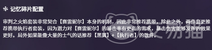 记忆碎片的搭配是决定战力释放效率的关键环节。推荐优先选用「审判之火焰」套装——其主属性与特效均深度契合赛雷尼尔的暴击驱动型输出模型,能有效放大暴击收益。副套则建议补足两件「执行者」,该套装提供的潜力属性可直接提升暴击率,进一步压缩暴击波动区间。两套协同作用下,整体输出曲线更趋平滑,爆发峰值亦有明显抬升。