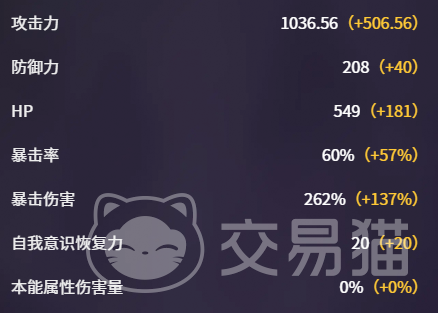 在基础属性层面,赛雷尼尔拥有1036.56点初始攻击力,经各项加成后可稳定突破1500阈值;防御力为208,配合常规增益即可满足中等强度副本的承伤需求,无需刻意堆叠生存向词条。输出维度上,其暴击率可达60%,其中57%来自主动加成,暴击伤害固定为262%。这一数值组合保障了普攻与技能命中时的暴击触发稳定性,使其天然适配高频输出定位。此外,20点自我意识加成能显著提升角色专属机制的响应频率与循环效率。