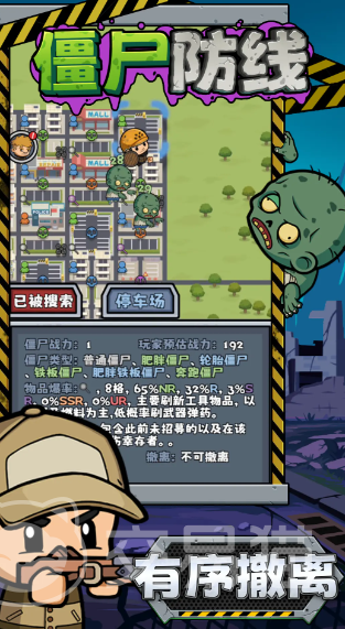 游戏核心围绕“探索—防御—撤离”三阶段闭环展开:小队进入废弃停车场等高危区域搜寻物资,木板可即时构筑路障延缓尸潮推进,食物则用于维持队员生命值与战斗持续性;遭遇普通丧尸或高防御的肥胖铁板僵尸时,系统自动切入塔防部署界面,玩家需在预设路径上合理配置武器类型与具备专属技能的幸存者,实现精准拦截。