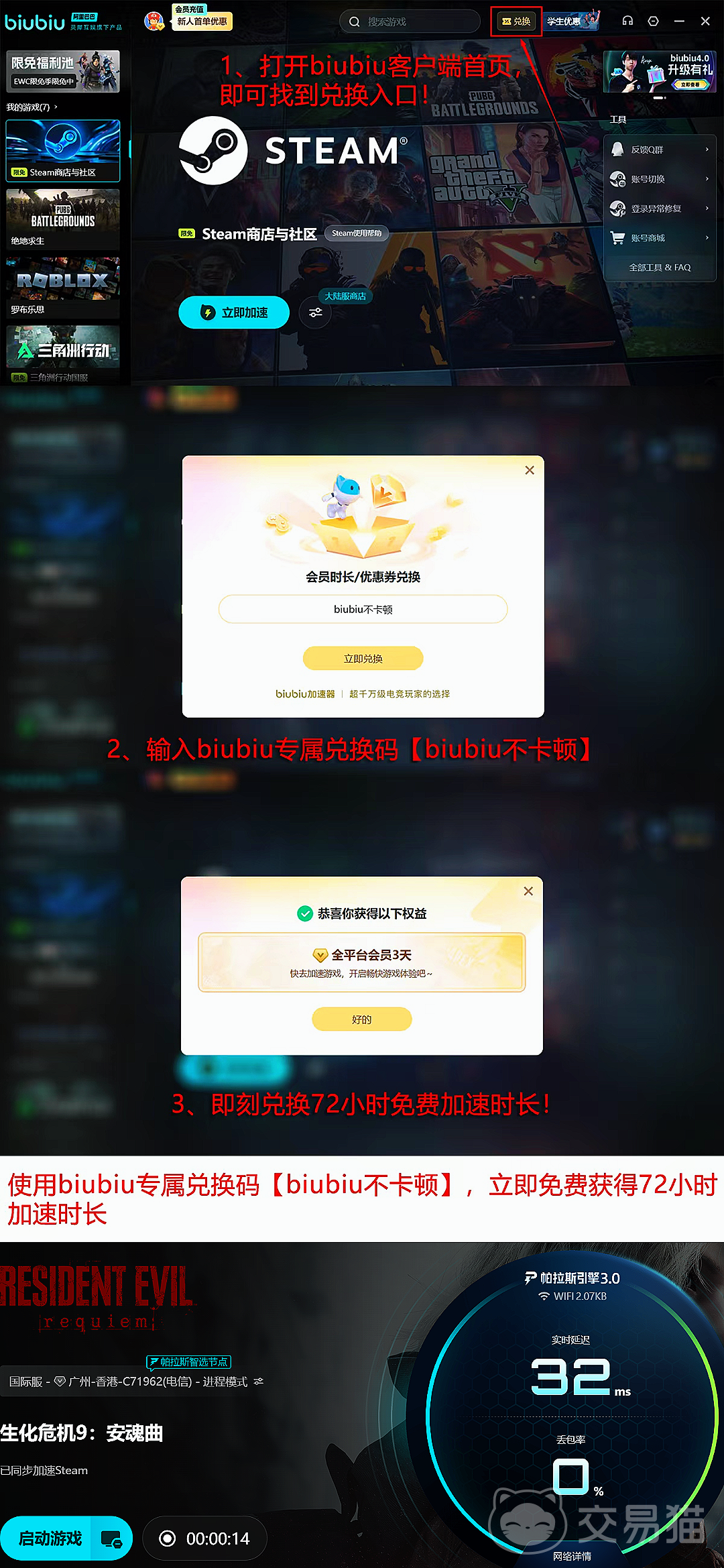 为提升用户接入体验,平台提供多项实用权益:输入兑换码【biubiu不卡顿】即可获赠3天全游戏加速服务;新注册用户完成基础验证后,自动解锁24小时全场通用加速权限。