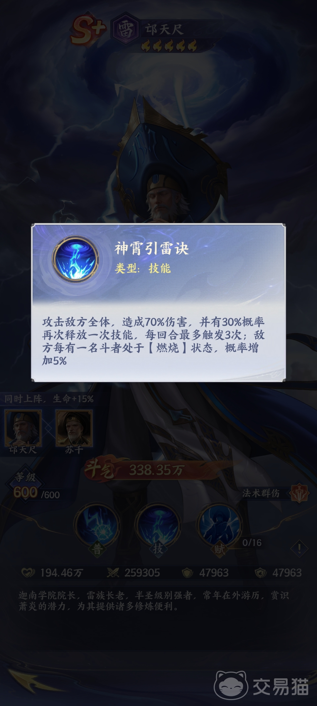 作为《斗破苍穹》正版授权手游中的高人气角色,邙天尺身份兼具迦南学院院长与雷族长老双重背景。其定位为纯法术伤害型法师,在实战中以雷电与火焰元素协同机制为核心,具备显著的群体压制力与持续爆发潜力。