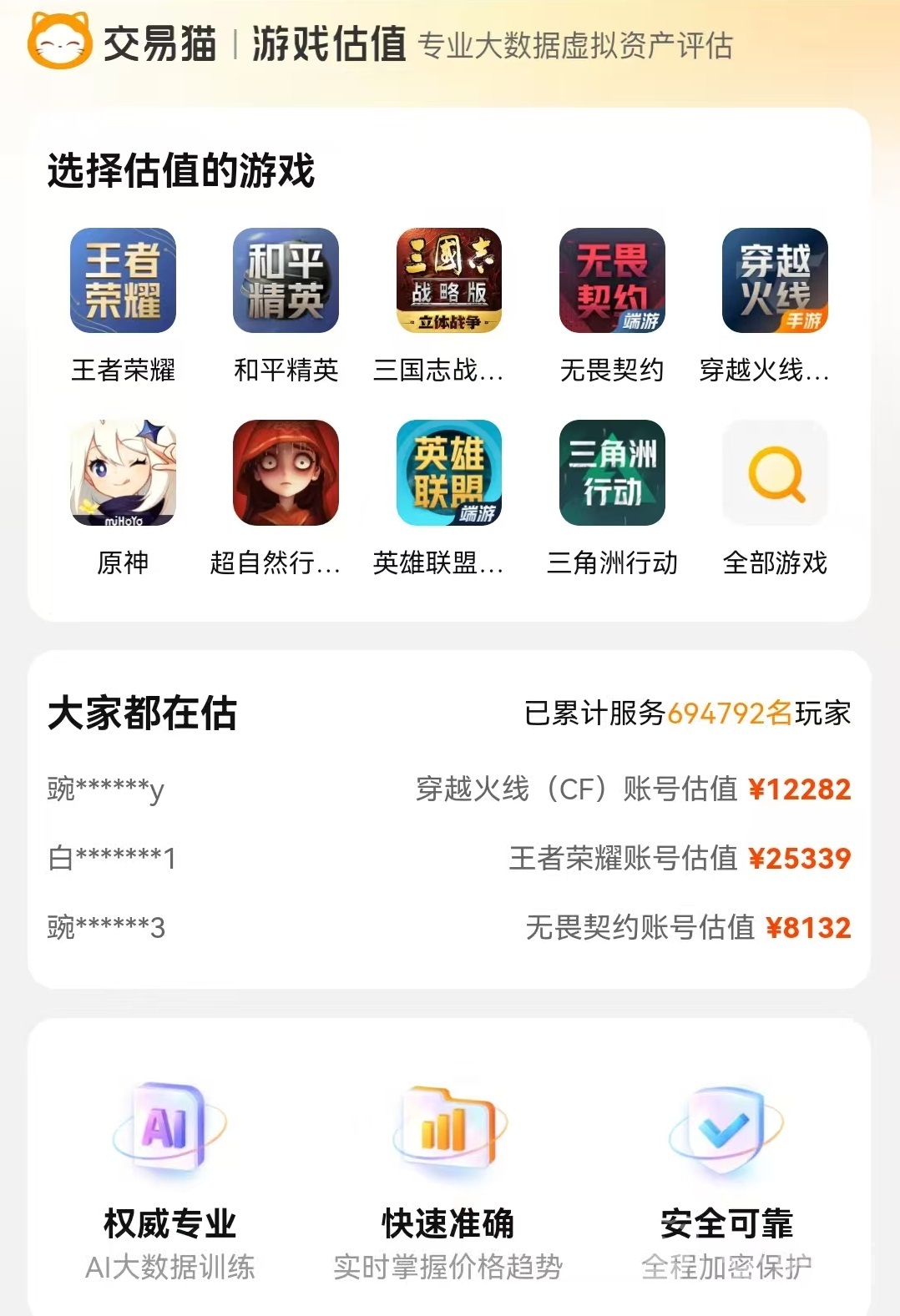 打开之后,在主页面就可以直接看到估值选项。的估值采用了大数据加AI智能的方式,是专业大数据资虚拟资产评估平台。具有权威专业,快速准确和安全可靠的特点。在估算过程中利用AI大数据训练出来的模型快速识别,然后根据自身海量商品账号实时掌握价格趋势,再加上全程加密保护,不会出现泄露账号信息的问题。目前估值已经覆盖很多热门游戏,正在不断添加中,例如和平精英、王者荣耀、原神、三角洲行动等,在这里都可以直接进行估值。