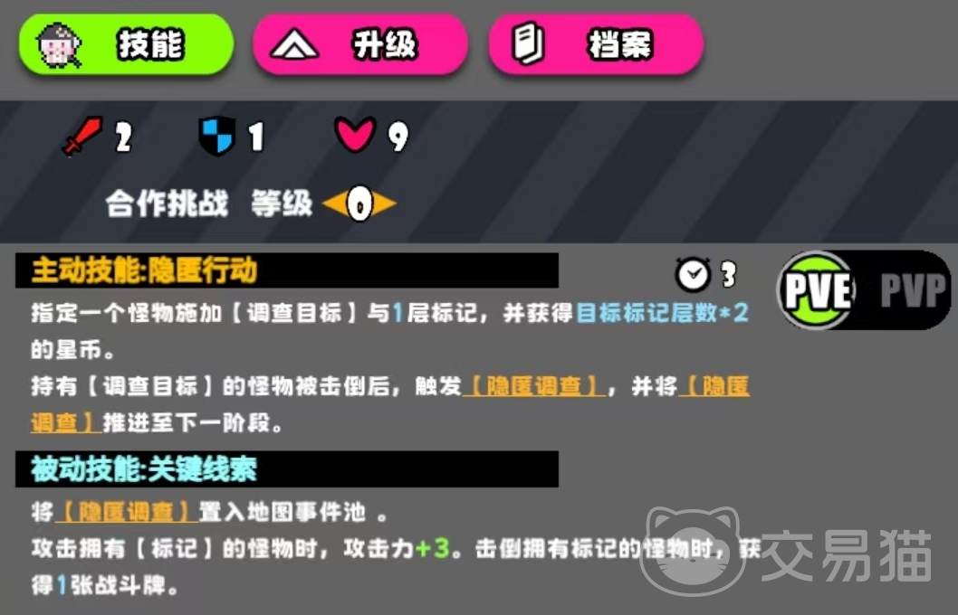 在PVE副本中,邦妮可主动选定任意非首领怪物施加“调查目标”标记,每次释放即获得等同于该怪物调查目标标记数值×2的星币。若被标记的怪物被任意玩家击倒,则立即触发“隐匿调查”效果,并依序推进阶段:阶段1时,邦妮与击倒者同步进入不可被挑战的隐匿状态,且二者均可对6格范围内所有非首领怪物施加1层标记;阶段2在阶段1基础上,额外赋予邦妮与击倒者各1张战斗牌;阶段3进一步扩展至全场所有非首领怪物,统一附加1层标记;最终抵达“真相揭露”阶段时,首领敌人将承受2层标记,全体玩家各获得1张战斗牌,并同步进入隐匿状态。