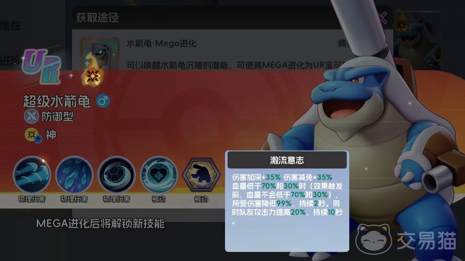 超级水箭龟的核心机制围绕“觉醒被动”展开:当完成二阶MEGA进化后,其生命值首次降至70%时,将触发持续2秒的99%伤害减免效果,有效规避敌方关键爆发伤害。升至五阶MEGA突破后,该被动扩展为双阈值触发——除70%血量外,30%血量节点亦可再次激活,并在每次生效时,为全体己方宝可梦提供20%攻击力提升。这一设计不仅显著强化自身生存韧性,更赋予其稳定团队增益能力,在多段战斗节奏中发挥枢纽作用。
