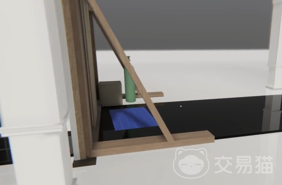 新区域**矗立一栋独立房屋。从侧方电箱攀爬至屋顶,点击获取第一张蓝图。下楼后依据场景中悬浮圆锥体的指向行进,临近目标门扉时天象突变,开始降雨。穿过雨幕中的门,进入双排密闭走廊,无视两侧房门,笔直前行。