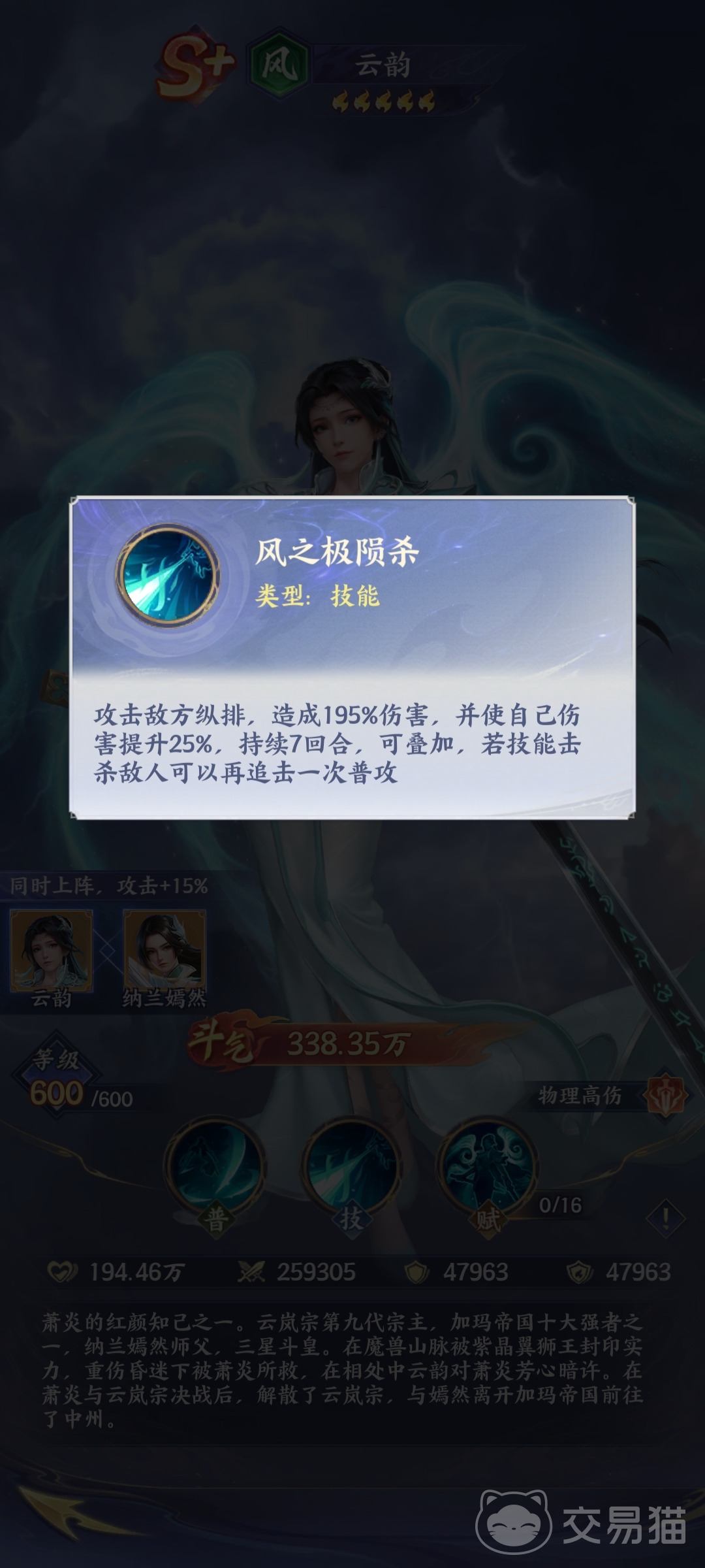 二、主动技【风之极·陨杀】:锁定敌方单列目标施放范围穿透打击,造成高额法术伤害,并为自身附加【风蚀】状态——持续7回合,每层提升云韵12%攻击力;该状态可叠加,每次成功释放技能(含普攻追击)均可触发一层叠加,最高可达7层。此设定强化了云韵越战越强的滚雪球特性,适合中后期持久战环境。