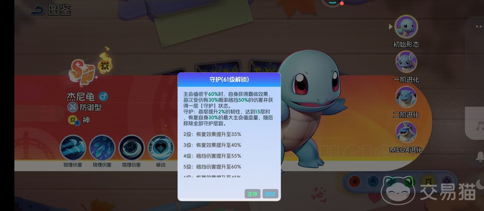 守护技能于61级解锁,触发条件为生命值低于60%。进入霸体状态后,每次受击均有30%概率格挡50%伤害,并叠加1层守护效果;每层提升2%韧性,叠满15层后额外恢复30%最大生命值。该机制赋予杰尼龟越战越强的反杀逻辑,尤其在劣势局中可通过精准拉扯完成极限翻盘,大幅提升容错率与战术纵深。