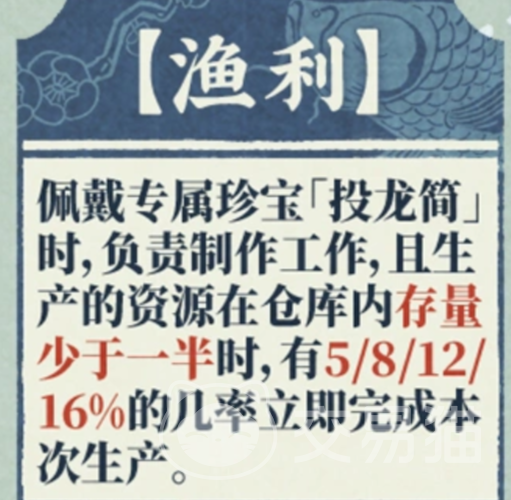 另一技能“渔利”,需在佩戴专属珍宝“投龙筒”的前提下触发。当其负责制作且对应资源库存不足一半时,本次生产有5%、8%、12%或16%概率实现即时完成,大幅提升资源周转效率与建造节奏。