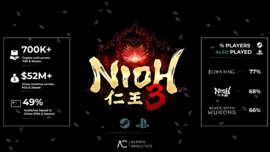 Team Ninja开发的暗黑战国动作角色扮演游戏《仁王3》自2026年2月6日发售以来,市场表现强劲。据分析机构Alinea Analytics估算,游戏在PS5与PC平台发售仅四天(截至2月10日)累计销量已突破70万份,预估总收入超过5000万美元。