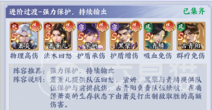 【稳控双盾流】——适合突破瓶颈期玩家 核心构成:萧炎(物理高伤)、萧薰儿(法术回怒)、紫妍(护盾承伤)、黑擎(护盾增伤)、青鳞(吸血免伤)、古青阳(群疗免伤) 该体系以防御韧性为根基,紫妍提供初始护盾吸收大量伤害,黑擎随即叠加增伤效果,使护盾具备反制输出能力;萧炎与萧薰儿形成攻守闭环——后者通过高频技能快速积攒怒气,为前者大招释放提供能量支持,实现持续压制;古青阳的群体治疗与免伤进一步延长团队作战时间。开局优先触发紫妍护盾,紧接黑擎强化,青鳞适时开启吸血免伤,整套流程节奏清晰、容错率高。