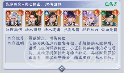 【连击循环流】——面向高难度副本与竞技场的毕业配置 核心构成:萧炎(物理高伤)、萧薰儿(法术回怒)、美杜莎(法术连击)、紫妍(护盾承伤)、小医仙(群疗加攻)、青鳞(吸血免伤) 此阵容构建双重保障体系:紫妍护盾承担前排压力,青鳞吸血免伤实现持续反哺;萧薰儿怒气供给与美杜莎连击机制深度耦合,形成“回怒→充能→连击→爆发”的稳定循环;小医仙在敌方大招释放后施放群疗,兼顾血线修复与攻击强化。起手顺序为紫妍开盾→青鳞挂免伤→萧薰儿叠怒→美杜莎触发连击,全程节奏紧凑、输出密度高,适用于巅峰副本挑战及PVP高强度对抗。