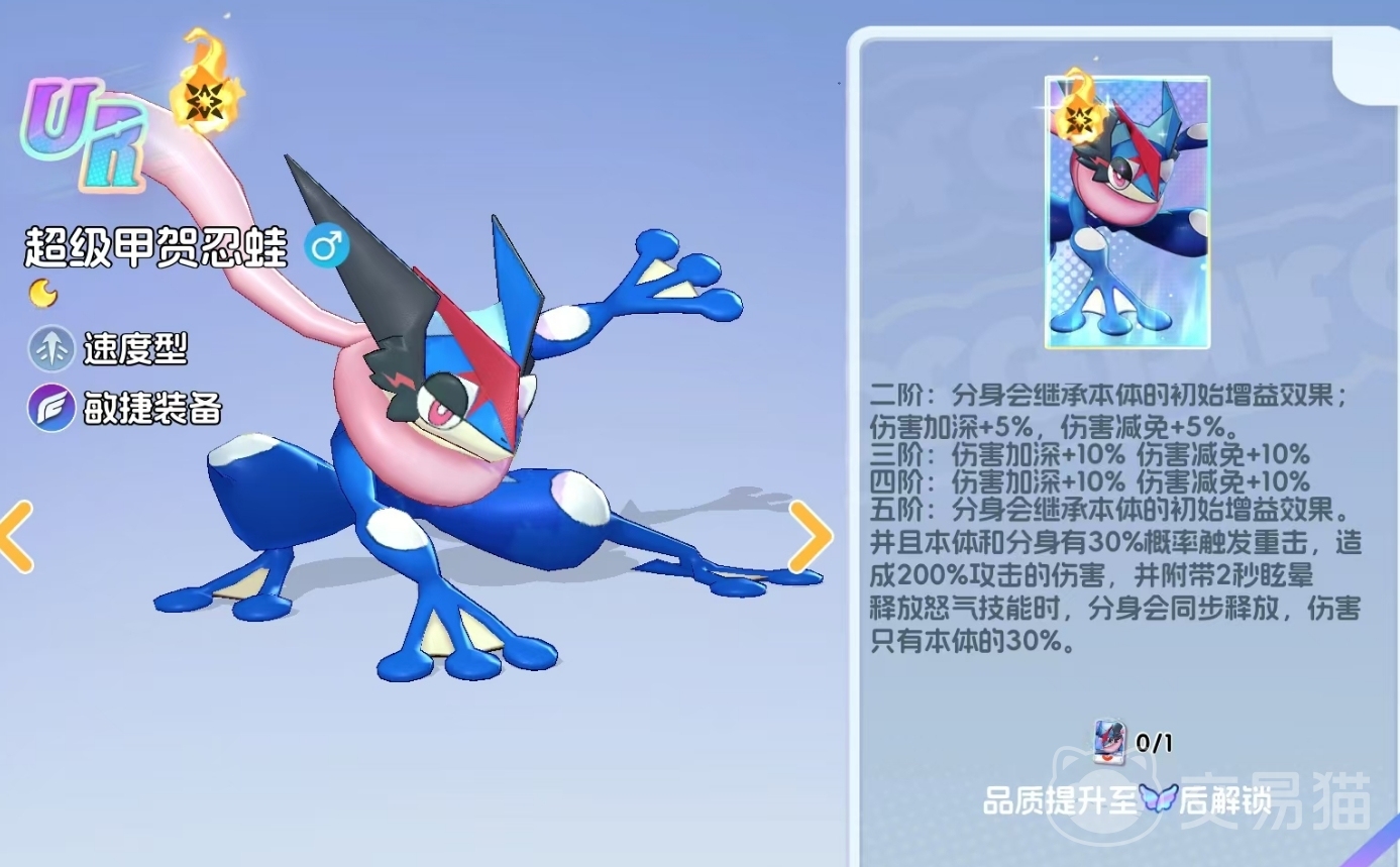 其核心机制围绕“影分身协同作战”展开。等级达到11级后解锁技能【燕返影分身】,该技能不仅实现位移至敌方后排发动突袭,更会在原位置生成一个具备本体属性继承能力的实体分身。此分身可独立施放41级技能【飞水手里剑】,与本体同步输出;最多可同时存在两个分身。每存在一个分身,均会提升呱呱泡蛙自身闪避率与吸血效果;当本体受到伤害时,部分伤害将自动转移至分身上承担;若分身被击破,则呱呱泡蛙立即恢复一定生命值,并获得物理伤害加成。