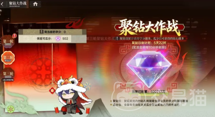 「聚钻大作战」采用双阶段协同机制,共设三轮循环。每轮包含“聚钻日”与“瓜分日”两个时段:聚钻日期间,全服专员累计学分总量决定当轮钻石奖池总额;瓜分日开启后,按各专员个人累计学分占全服总学分的比例进行钻石分配。因此,提升个人学分获取效率是提高最终收益的关键策略。