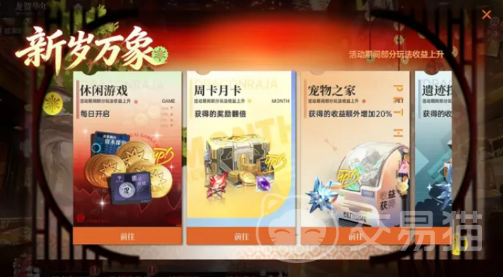 「新岁万象」属于全局性增益系统,活动期间休闲类小游戏每日限时开放,周卡与月卡基础奖励提升至原标准的两倍,部分常规玩法产出亦同步上调。该模块无需额外操作,所有加成自动生效,适配玩家原有养成习惯。