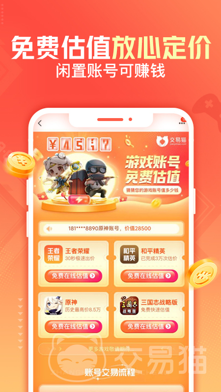 app给大家直接安排了免费估价的功能,非常实用也很简单,不管你是想卖王者、和平精英、原神,还是三国志等等,都能轻松使用这个功能,操作很简单,打开点击右下角我的,往下滑一滑就能找到免费估值,选择好自己要卖的游戏,然后跟着系统的提示,如实填写账号情况就行。系统会自动参考平台上同款账号的价格,再结合当下热门道具的价值波动,分分钟就能给出参考定价。