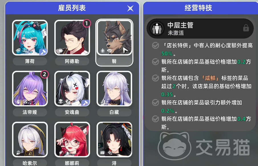 员工配置直接影响店铺产能。每位角色具备唯一技能标签,如“调酒专精”“烘焙专长”“饮品调配”等。须严格依据技能类型匹配岗位——调酒师驻守吧台区,烘焙师负责甜品制作间,否则将导致服务响应延迟、顾客流失率上升,直接削弱单位时间营收能力。建议在雇佣前查阅角色技能档案,构建人岗高度适配的运营团队。