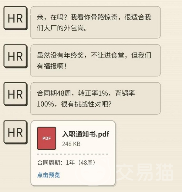 游戏整体风格写实而不失幽默,界面简洁,操作门槛低,适合碎片化时间体验。它不追求高强度数值成长,而是通过事件选项、状态反馈与阶段性复盘,让玩家在虚拟环境中感受外包岗位特有的节奏张力与职业成长路径。