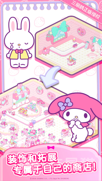 《Hello Kitty My Dream Store》由三丽鸥官方授权开发,完整呈现Hello Kitty及库洛米、玉桂狗等超30位经典角色形象。每位角色均可担任店铺员工或店长,通过游戏内扭蛋系统,使用钻石或金币抽取心仪伙伴,收集过程充满惊喜与期待。