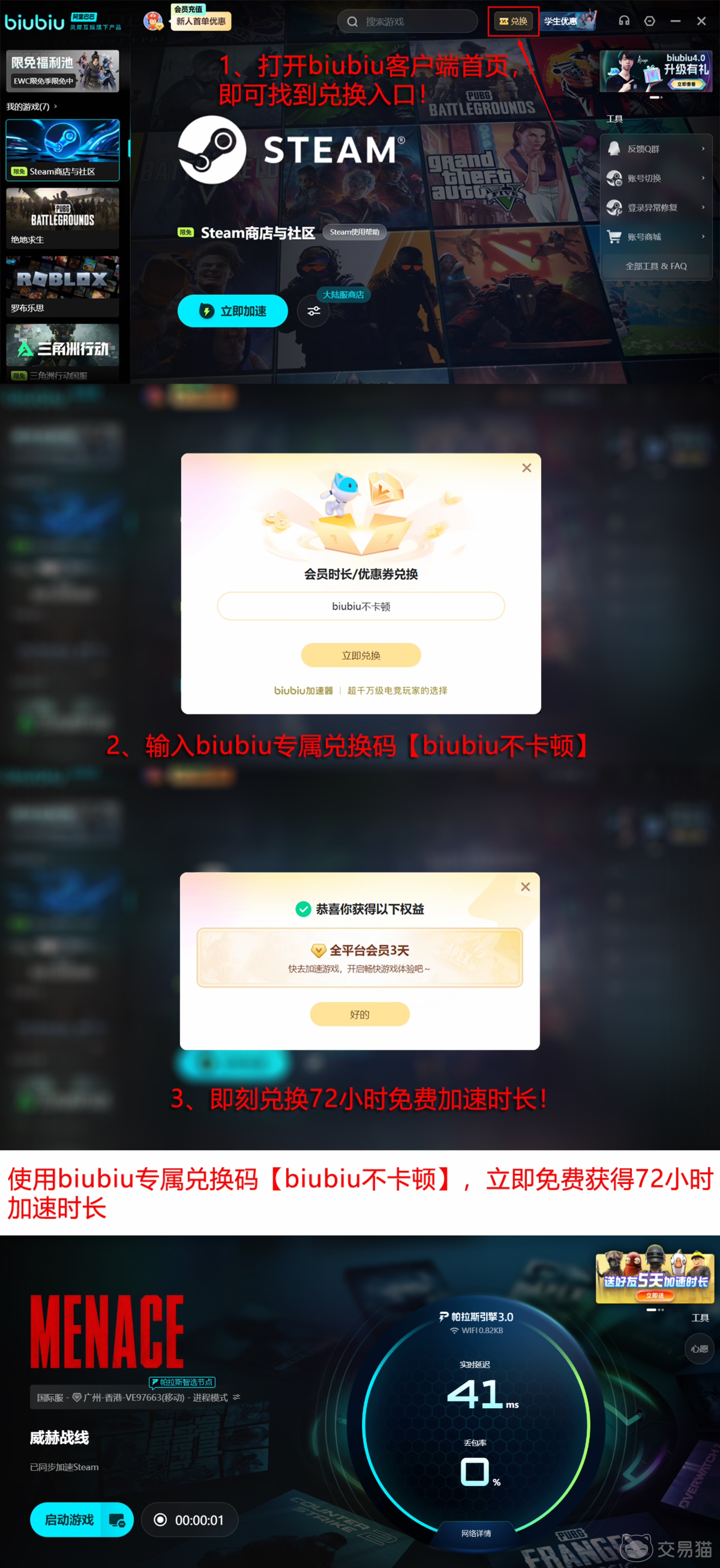 新用户首次安装biubiu加速器后,可直接领取24小时免费加速时长;完成注册的用户输入口令【biubiu不卡顿】,即可激活一次3天VIP加速权益;老用户回归登录还可参与限时充值优惠活动。