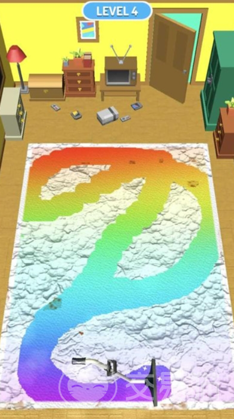 游戏采用分关卡推进机制,每关呈现一张具有独特纹理或几何构图的脏污地毯。任务目标并非统一要求“全面清洁”,而是依据当关指令动态设定——例如某关仅需清除所有可见垃圾颗粒,此时可跳过吸尘器操作,直接使用手指点击拾取并丢弃杂物;若时间充裕,再启用吸尘器进行二次处理,有助于提升最终评分与得分表现。