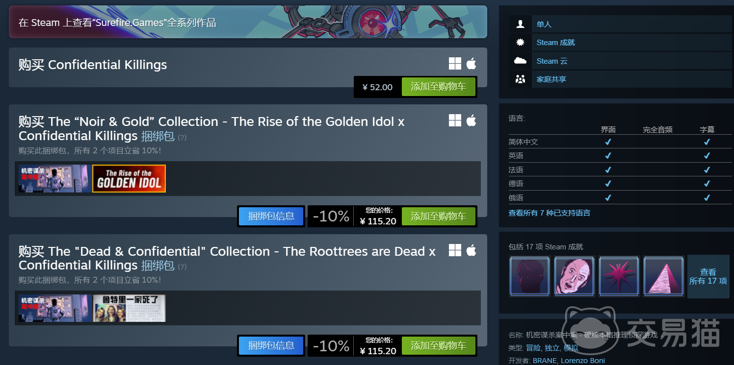 《机密谋杀案中案》Steam国区标准售价为52元。首发期曾推出限时特惠价46.8元,目前该活动已结束。但根据Steam历年运营节奏,推理类专题促销(如“推理节”)通常会带来至少10%的折扣;此外,游戏支持与其他同类型推理作品打包购买,可进一步降低单款成本,具体折扣幅度以实际页面展示为准。