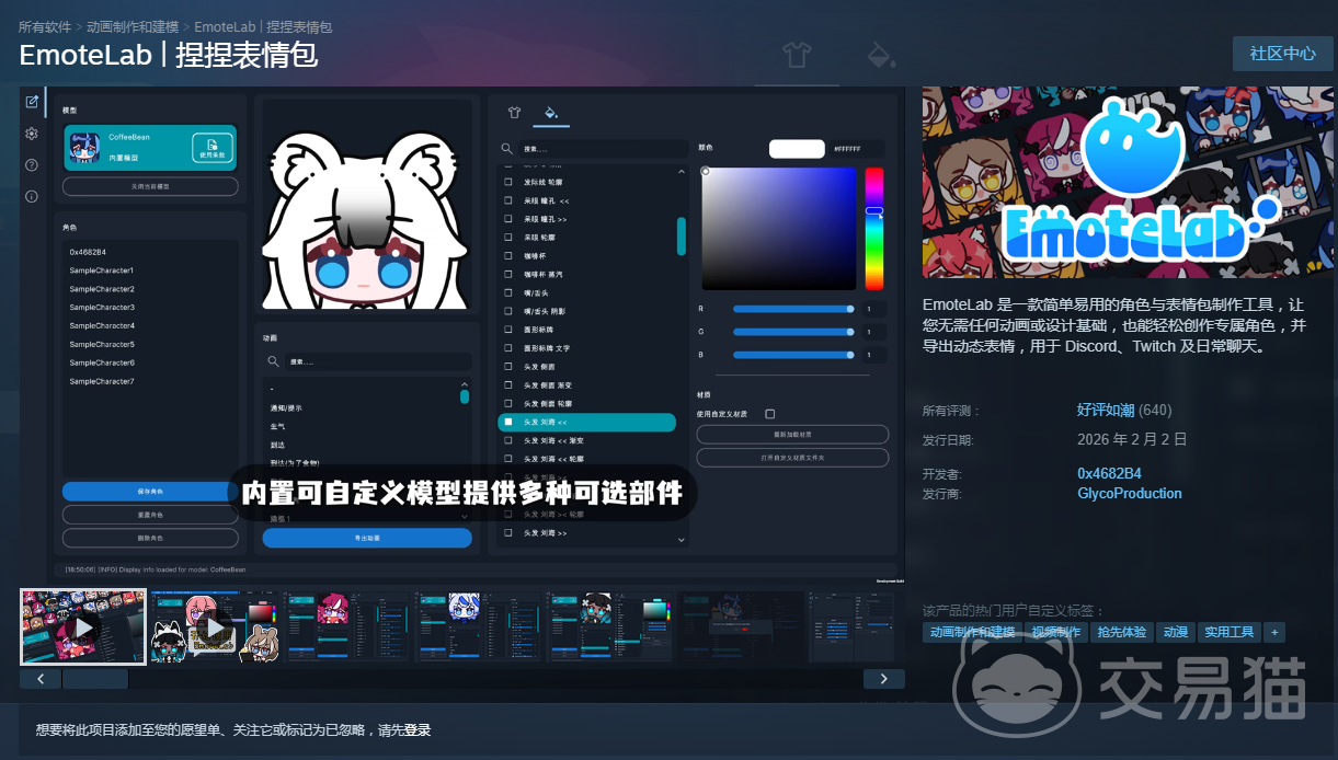 EmoteLab是一款面向Windows平台的动态角色与表情包创作工具,专为零基础用户设计,无需任何美术或动画经验即可快速上手。它并非传统意义上的游戏,而是一款功能完备的创意生产力软件,支持从角色建模、色彩定制到动画生成的一站式流程。本文将为您详细介绍EmoteLab的正式发售信息及核心创作能力。