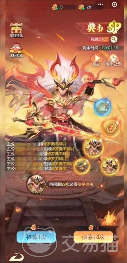 当前版本中,SP典韦为强度梯队顶端角色,基础资质达210点,实战表现具有显著压制力。该角色不进入任何常规卡池,仅能通过碎片合成获取。期间会配套推出限时特惠活动,定向投放其碎片,但整体成本较高,对资源储备量提出明确要求,属于中长期培养目标。