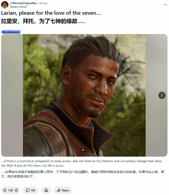 在《神界:原罪》的Reddit社区上有这样一则帖子引起了很多玩家的共鸣,玩家MisterInfinite1发帖称:“拉瑞安,求求你了,看在诸神的份上,如果抢先体验里有一个很酷的黑人同伴,千万别听这个粉圈的意见。如果你这么做了,斯温(拉瑞安工作室CEO),我这条命就是你的。”他还同时附上了《博德之门3》起源角色之一(也可作为同伴)的威尔的图片举例。
