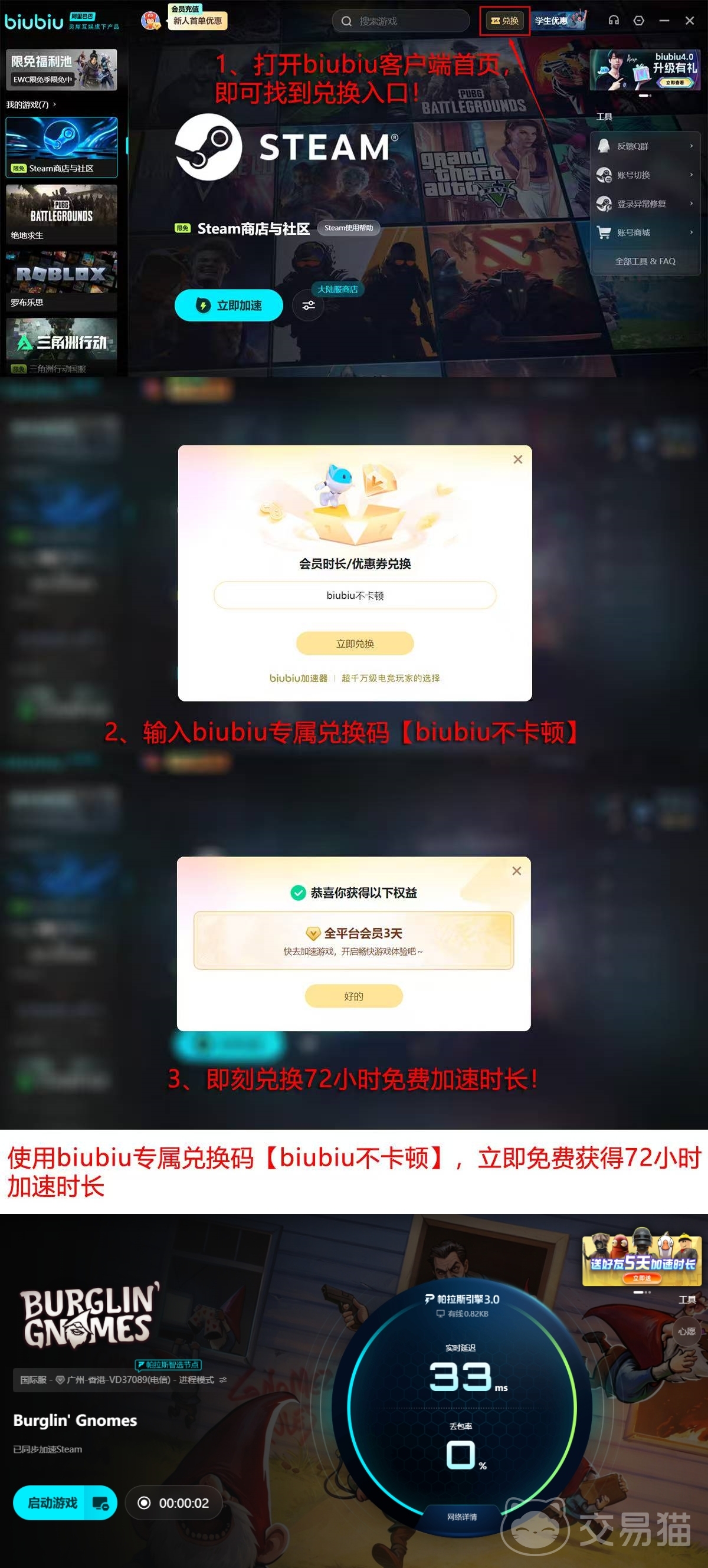 该工具搭载自研帕拉斯3.0引擎,在协议识别、节点调度与延迟抑制方面具备较强技术积累,可显著降低联机过程中的丢包率与波动幅度。其网络稳定性已获得职业电竞领域验证,现与PUBG职业选手xdd建立长期技术协作关系。用户可通过官方渠道获取限时福利:输入兑换码【biubiu不卡顿】可激活72小时高级服务权限;新注册用户还可直接领取24小时免费使用时长。