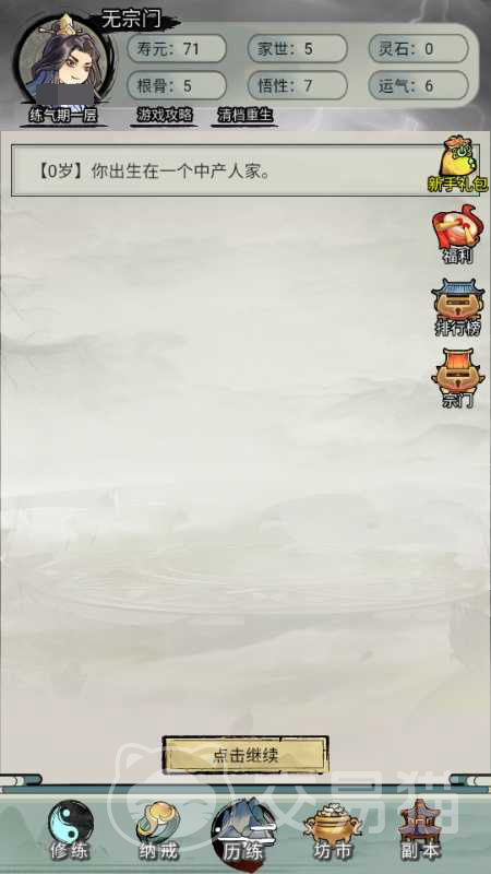 游戏提供多条差异化修仙路径,包括但不限于剑修、丹修、符修、阵修与御兽等流派,每条路线均配备专属成长数值体系、剧情分支及结局走向。角色初始灵根属性为程序化随机生成,涵盖单灵根、五灵根及变异灵根三种类型,直接影响资质上限与功法适配性。